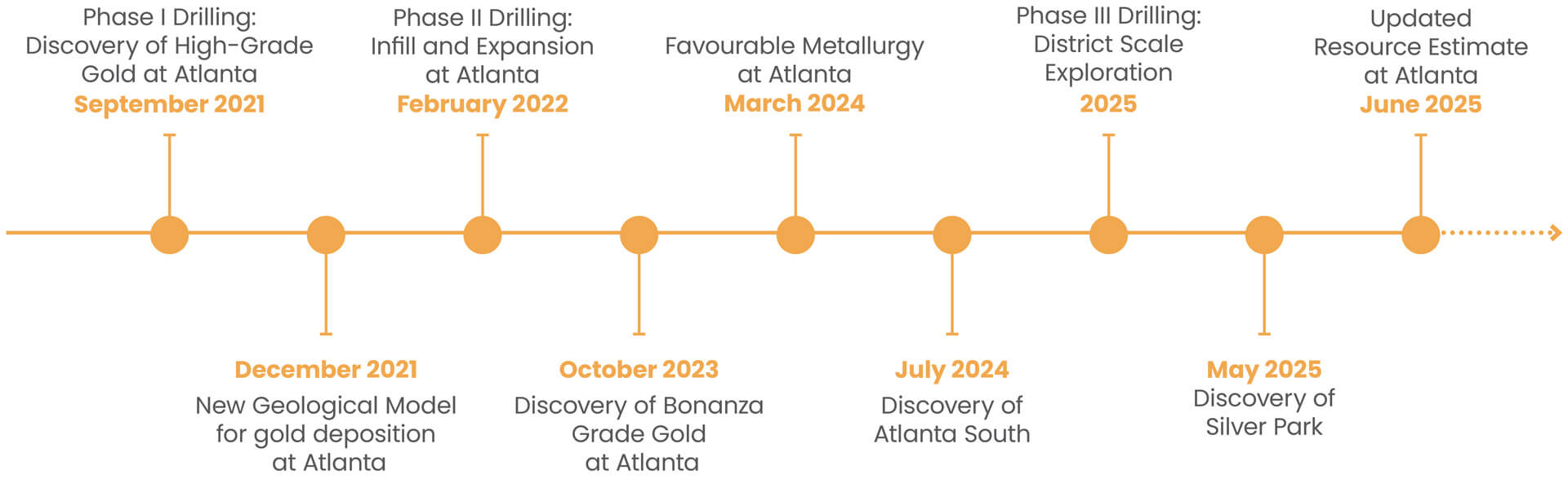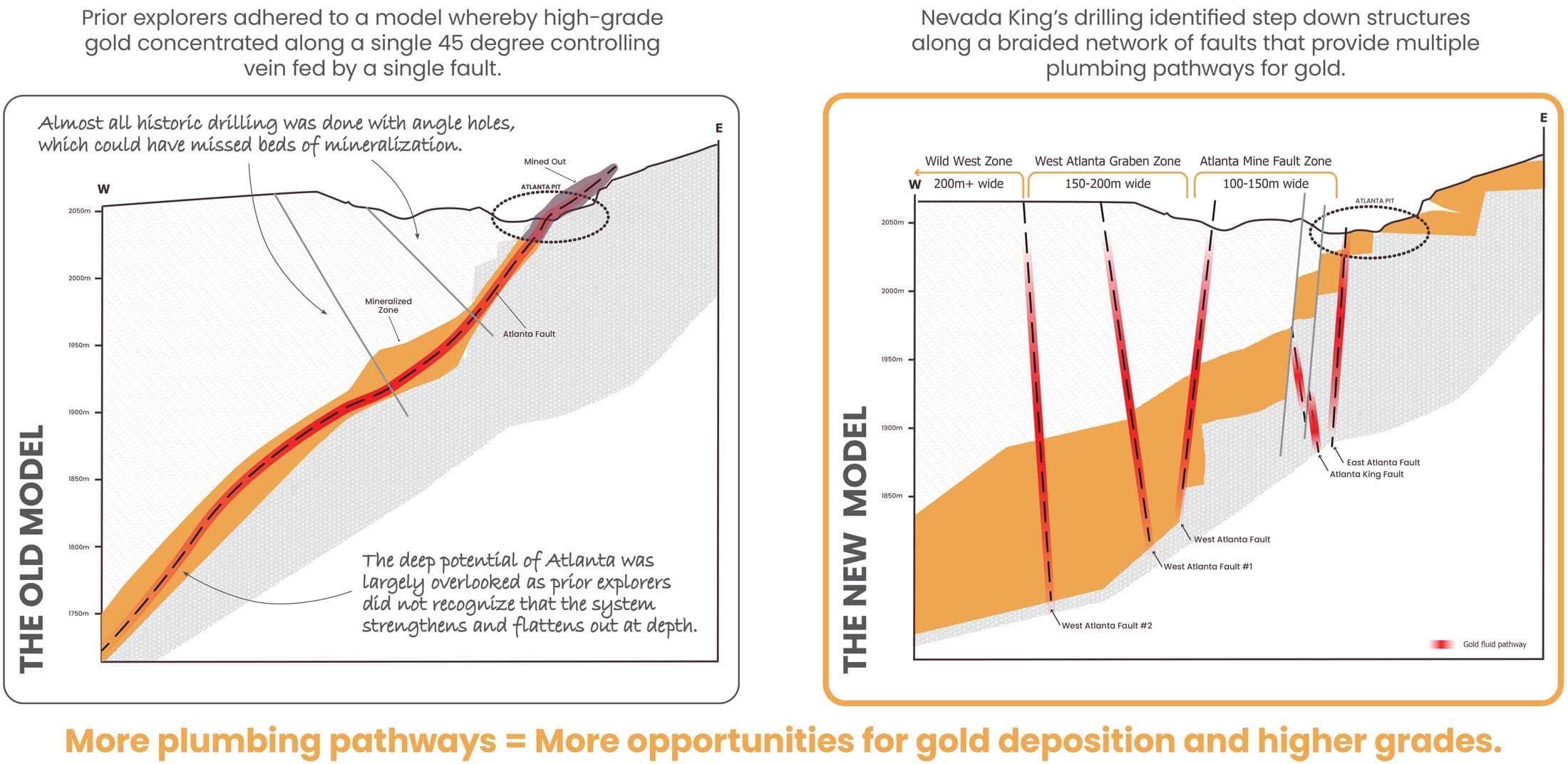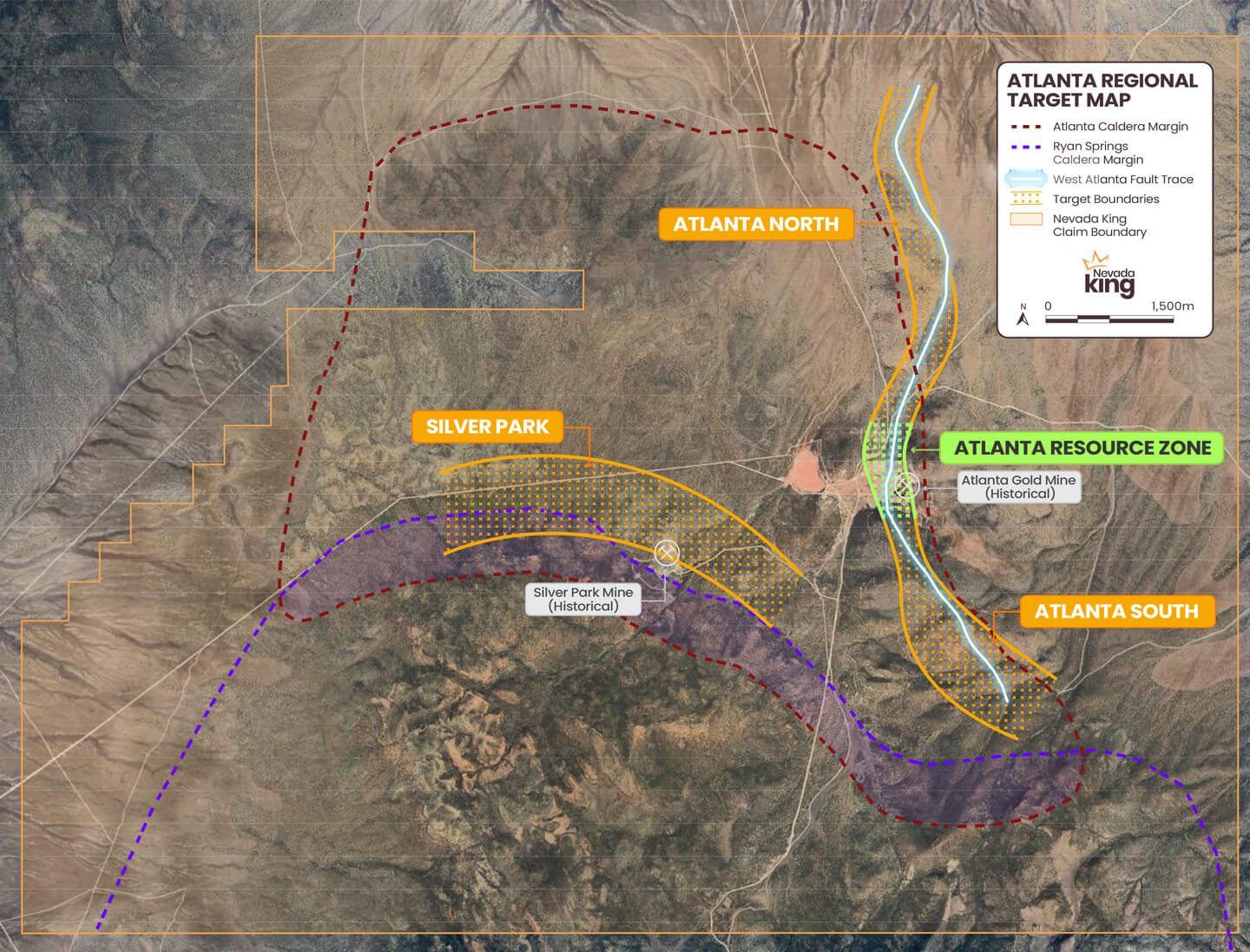 Nevada King purchased 100% of the Atlanta Gold Mine project in 2018 and began exploratory drilling. Phase I drilling in 2021 identified previously unrecognized high-grade gold at the bottom of the Atlanta pit, as well as high-grade gold 560 meters north of the pit. This demonstrated a larger footprint of high-grade gold than previously recognized at Atlanta and paved the way for a new geological interpretation.